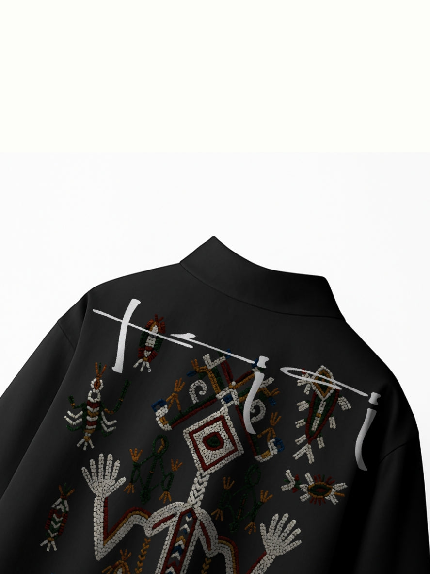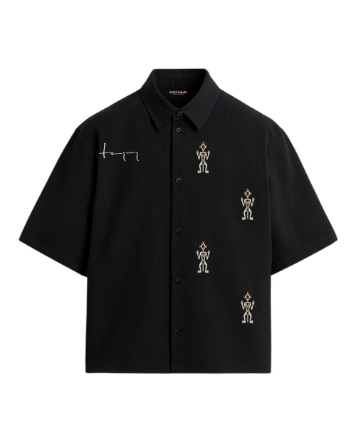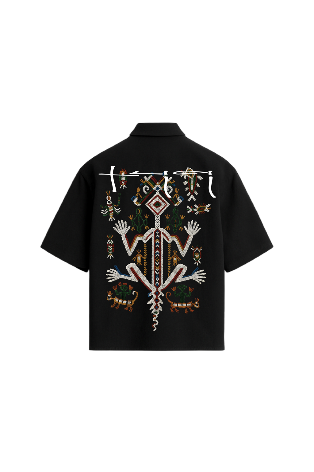 Up front, four abstract tribal motifs and the offbeat ‘TRICI’ branding add subtle bursts of creative attitude. Spin it around, and the back erupts with intricate, folklore-inspired artwork that’s wild and unapologetic. This is a shirt that turns every exit into an entrance, always making a statement.